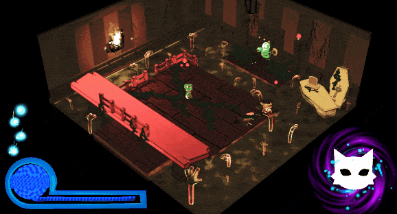 As a Nekomancer, you have access to spells of resurrection. To cast a resurrection spell, you'll need to tag a ghost with the swipe of a magic-infused paw. Ghosts of different animal species require different glyphs to cast the resurrection spell. You must resurrect all the ghosts in both realms to clear a path forward!